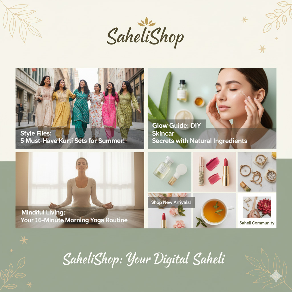 ✨ चाहे आप ढूंढ रही हों latest outfit ideas, skincare tips for glowing skin, या healthy lifestyle inspiration, SaheliShop हमेशा आपके साथ है — आपकी digital saheli बनकर 💕